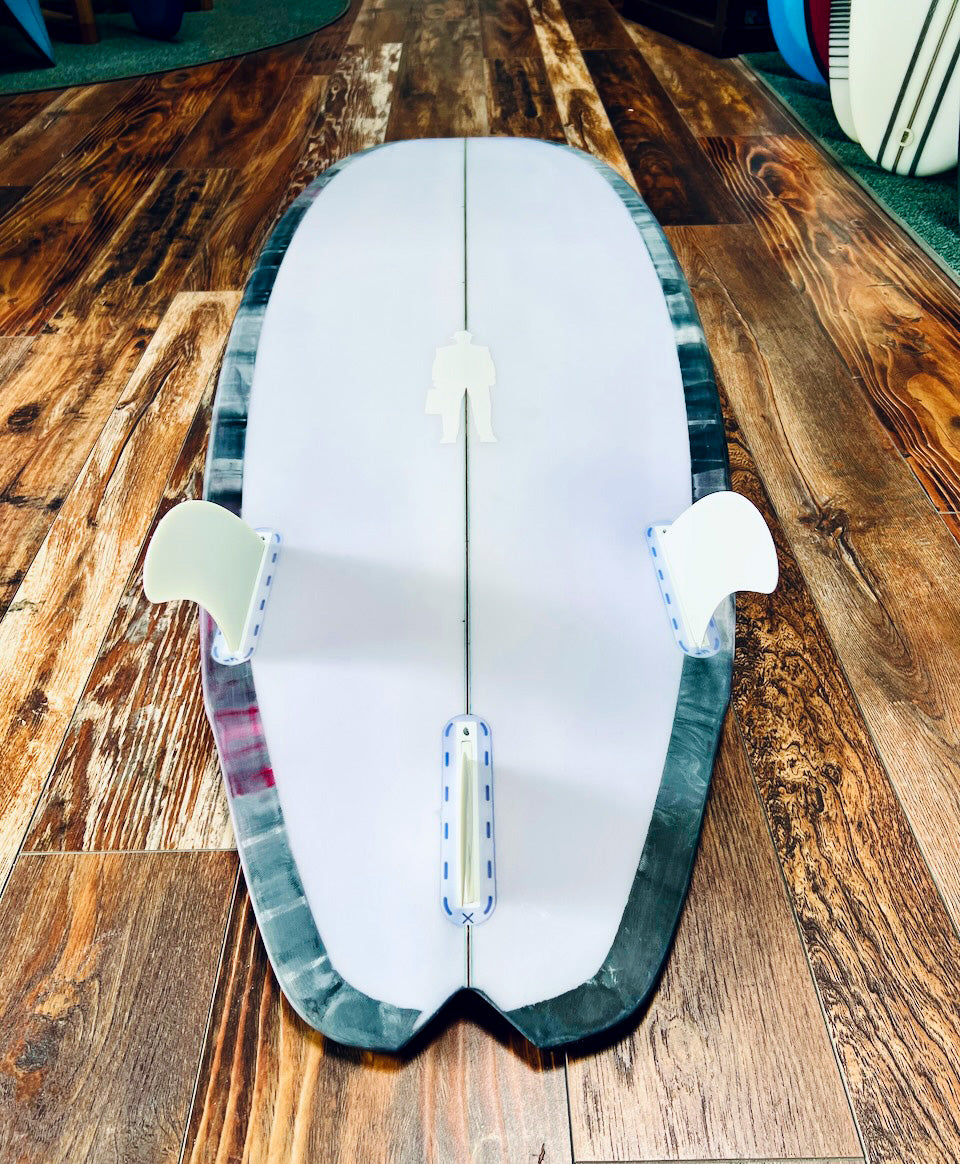 Twin Rascal - featuring more tail rocker, the stealthy shallow swallowtail ‘pizza slice’ so you can get your foot way back, the glass-on True Ames twins with small trailer, single-to-double-to-spiral vee hull contour, flat deck, u-deck, with tapered downrails especially thinned out through the fins for bite and responsiveness. I also placed the fin cluster closer together on this one i.e. by moving the front fins further back and the back fin further up to pull a nice tight arc in turns.