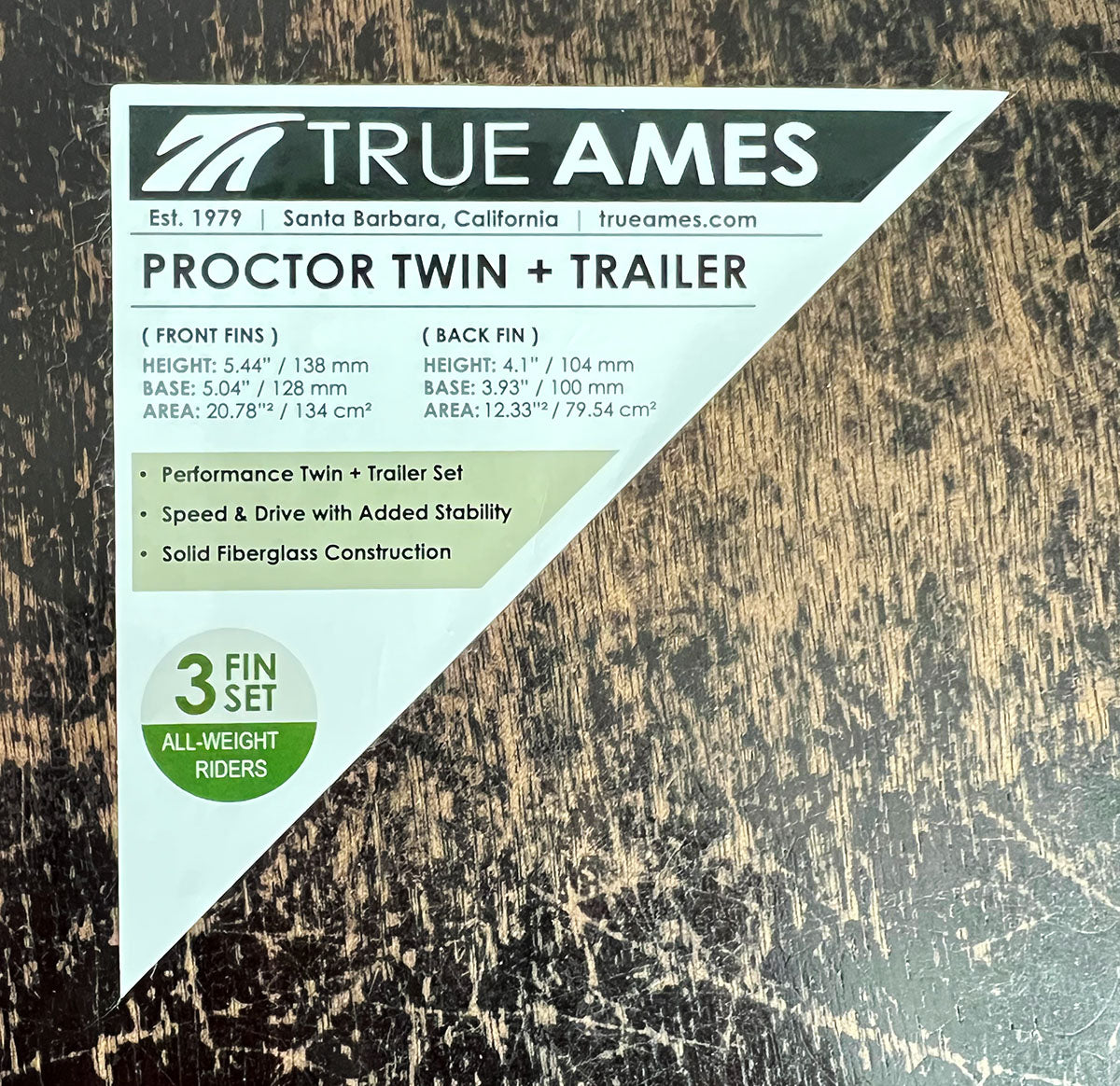 The new fiberglass sleek foiled "Magnum Opus" 5 1/8" twin fin base with smaller trailer fin (which is larger than the standard 2+1 trailer) - a power surfer's dream 2+1 setup.
